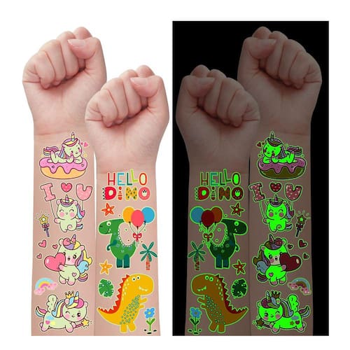 -?Tatuagens luminosas de unicórnio e dinossauro para crianças?Combinação incrível de tatuagens temporárias de unicórnio e dinossauro para crianças. Mesmo em uma festa com muitas pessoas, essas tatuagens brilhantes farão com que você seja único na multidão! Comprar apenas um conjunto de tatuagens pode atender às necessidades de meninos e meninas ao mesmo tempo.