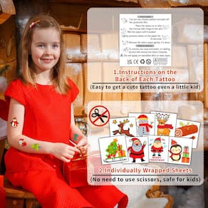 -?Grande surpresa para o Natal?O pacote contém 50 estilos de tatuagens temporárias de Natal com estampa colorida. Sem padrões repetidos. Escolha perfeita como meias para dar uma grande surpresa aos seus filhos! As tatuagens temporárias da Party passam por testes rigorosos em festas. Garantimos que as tatuagens falsas durarão o dia todo ou mais.