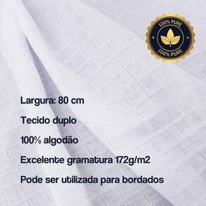 - Marca: Dugu Atacadista - COR BRANCA, não temos outras cores - Linha: PREMIUM - Largura: 80 cm - Tecido duplo - 100% algodão - Excelente gramatura 172g/m2 - Pode ser utilizada para bordados