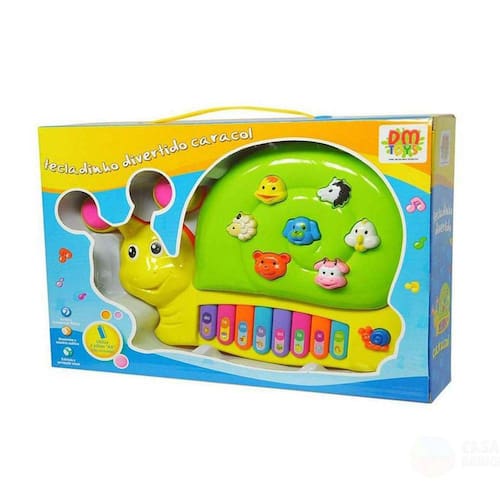 Teclado em formato de Caracol, disponível nas cores laranja e amarelo. Além da função de teclado, emite sons dos bichinhos e acende luz tornando a brincadeira mais divertida.