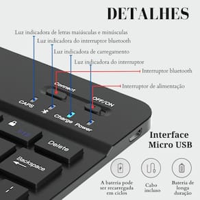Especificações: - Altura: 15cm - Largura: 24,5cm - Conector teclado: micro USB - Conector mouse: 2 pilhas AAA não inclusas - Configuração: ABNT 1 - Distância de trabalho: 10m - Conexão: via Bluetooth - Economia de bateria: após 10 minutos de inatividade - Peso: 190g