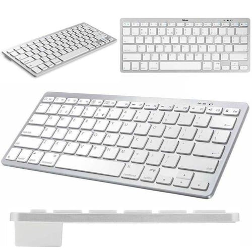 Teclado Bluetooth Tablet Android Branco O Teclado Bluetooth permite que você digite grandes textos com o conforto de um teclado de computador comum. O Teclado Universal Bluetooth, se adapta a todos os Tablets e Ipads, com ele você terá a facilidade de um notebook em seu Tablet Android. Alcance de transmissão do teclado de até 10 metros, muito compacto, leve, teclado com digitação macia e de belo design. Para conexão ao tablet sem nenhum tipo de adaptador, requer apenas a conectividade Bluetooth. Alimentado por duas pilhas AAA palito(NÃO INCLUSAS).