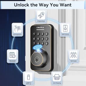 - Desbloqueio 5 em 1: 50 grupos de impressões digitais, 50 grupos de códigos de acesso de teclado, desbloqueio via aplicativo dentro de 50 metros, desbloqueio com um toque e teclas podem ser usadas para desbloquear. Fechaduras de porta com impressão digital podem gerar e compartilhar código único, permanente, cronometrado, recorrente, código personalizado e apagar código com visitantes diferentes e seus amigos.