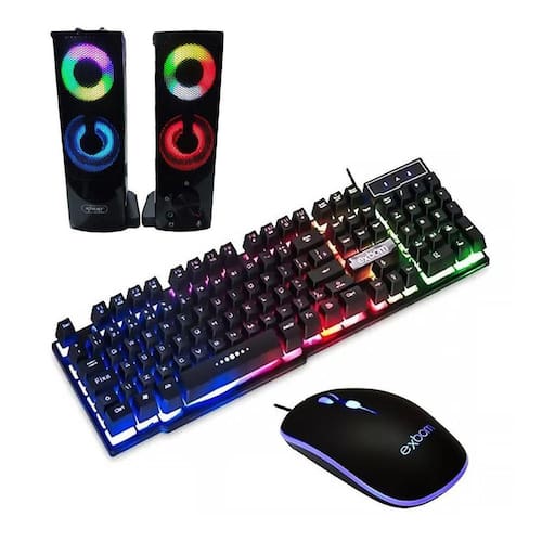 O kit teclado e mouse gamer usb bk-g550 Marca: exbomModelo: bk-g550Cor: pretoSistema: membranaTipo de conexão: com fioConector: usbTipo do cabo usb: emborrachadoPadrão: abnt2Quantidade de teclas; 107Estilo das teclas: suspensoAcabamento: plásticoIluminação led rgb: azul, verde, vermelhoAjuste de ângulo: nãoCompatível: windows 8/ 10/ 7/ vista/ xp/200/ osx/ 10.2 ou superior informações técnicas mouseResolução dpi: 800/1200/1600/2400Número de botões: 5Tipo de conexão: com fioTipo de cabo usb: emborrachadoConector: usbLed: sim altera cor automaticamente, sem escolha de cor Especificações- Iluminação especial que destaca as teclas Led de fundo coloridoDesign ergonômico Plug and play Pesos e medidas aproximados Medidas do teclado: 4 x 13 x 44 cm altura x largura x comprimento Medidas do mouse: 4 x 7 x 12 altura x largura x comprimento Comprimento do cabo usb teclado: 1,30 mComprimento do cabo usb mouse: 1,20 mMedidas da embalagem: 4 x 15 x 53 cm altura x largura x comprimento Peso bruto: 1,300 kg Mini alto-falante para pc knup kp-6040Compatível com pcs e notebooks, fabricado em material resistente, controle de volume, este produto é protegido magneticamente.Alimentação usb.Especificação técnica:- potência de 12w rms 6w x 2 - frequência de resposta subwoofer : 100 - 20khz- conexão: usb- fonte de alimentação: 5v dc- impendência: 4 ohms- sensibilidade: 70db+-4db