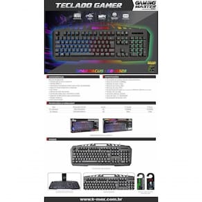 Teclado Gamer - SPARTACUS - KB-A328 Especificações Técnicas Dimensões do produto (CxLxA): 481x176x33mm Peso do produto: 0,688kg Material da base: metal Material das teclas: ABS Material do cabo: PVC Comprimento do cabo (sem conector): 1400mm 50mm (tolerância) Tensão: 5V via USB Corrente elétrica: 100mA Ciclo de vida: +/- 10000000 Quantidade de teclas: 104 Garantia:01 ano de garantia Informações da Embalagem Embalagem Individual com 01(uma) Unidade Dimensões (C*L*A): 492*195*43mm Peso Líquido: 0,688Kg Peso Bruto: 0,900Kg Embalagem Coletiva com 20(vinte) Unidades Dimensões (C*L*A): 500*395*455mm Peso Líquido: 18,000Kg Peso Bruto: 19,000Kg