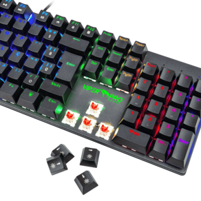 Capaz de ajustar o brilho e o estilo retroiluminado conforme necessário. 25 teclas anti-ghosting, permitem controle livre. Combinado com interruptores Red mecânicos profissionais e colisões táteis e cliques sonoros para o melhor desempenho de jogo. Tecla de bloqueio da janela: Pressione Fn + WIN-L para bloquear a tecla win para evitar sair do jogo por engano. Placa toda em metal. 12 teclas multimídia. Escolha o Outemu Red se você: Joga muito FPS Prefere teclas leves Se irrita com o barulho das teclas Não faz uso intenso de digitação Não tem problemas com missclicks