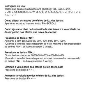 - Possui teclas de atalho, teclas com pressão de 50 milhões de cliques, luz de LED individual para cada tecla com efeito arco-íris em 8 opções de iluminação.