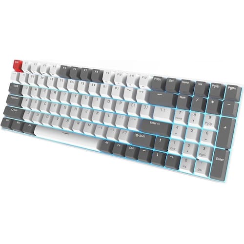 Um teclado quase completo, mas reduzido em tamanho (96%), incluindo o teclado numérico. Economia de espaço sem sacrificar funcionalidades essenciais, perfeito para setups otimizados. Switches Mecânicos Red (Lineares e Silenciosos):