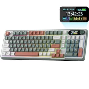 Disposição 96%: Design compacto com teclado numérico incluído para maior produtividade. Conexão em três modos: Com fio, sem fio (2,4 GHz) ou Bluetooth com até 3 dispositivos. Montagem superior: Maior rigidez para consistência em sensação e som. PCB hot-swappable: Troque switches sem soldar; design flexível para digitação suave. RGB com ritmo musical: 14 modos de iluminação personalizáveis e sincronização com música. Anti-Ghosting: N-key rollover para registrar todas as teclas simultaneamente. Espumas de 5 camadas: Redução de ruído e melhoria acústica com materiais avançados. Botão de alumínio: Controle de iluminação, volume e modos de conexão. Tela TFT: Mostra informações chave como bateria, data e modos. Bateria de 3750 mAh: Até 130 horas de uso com iluminação de fundo mínima. 2 portas USB: USB-C para carga e USB-A adicional para dispositivos externos. Cabo USB-C destacável: Inclui adaptador USB-C para USB-A para maior compatibilidade. Capa anti-poeira: Protege o teclado contra sujeira e poeira. Ampla compatibilidade: Funciona com múltiplos dispositivos e sistemas operacionais. Marca: Não Informado Marca: Não Informado Marca: Não Informado