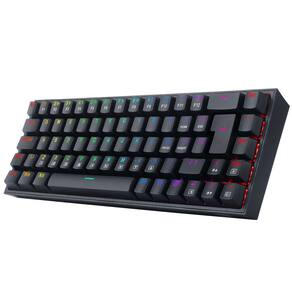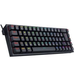 Teclas com sistema mecânico (Redragon Brown).Formato TKL 66%. Opção de Modo Game: desativa a tecla Windows. Iluminação RGB personalizável. Leiaute Brasileiro (Português). Matriz de tecla otimizada para game (para redução do ghosting). Interface USB v2.0. Pezinho retrátil (na traseira) para ajuste de inclinação.