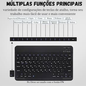 O teclado segue o padrão nacional de teclas ABNT 1 , garantindo familiaridade e precisão em sua digitação. Sua conexão via Bluetooth proporciona liberdade de movimento e praticidade ao eliminar os fios, dando-lhe mais espaço e flexibilidade em seu ambiente de trabalho. Além disso, o teclado possui bateria recarregável e acompanha um cabo micro USB para carregamento.