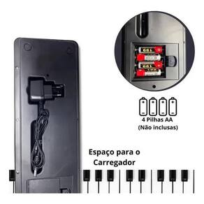 Modelo: Teclado Musical Infantil Número de Teclas: 37 Funções: Modo de aula, Controle de Volume, Efeitos Sonoros Alimentação: 4 pilhas AA não inclusas ou Fonte de Energia inclusa Conectividade: Entrada para Microfone Dimensões: 45 cm Comprimento x 14 cm Largura Material: Plástico HIPS e PS Conteúdo da Embalagem: 1x Teclado Musical Infantil com 1 caixa de som embutida 1x Cabo Carregador 1x Conector de Tomada 1x Microfone
