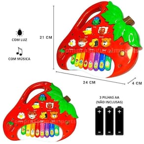 Piano musical em forma de morango, botões divertidos com desenhos de animais emitindo o som dos bichos. Teclado interativo e colorido emitindo musicas.