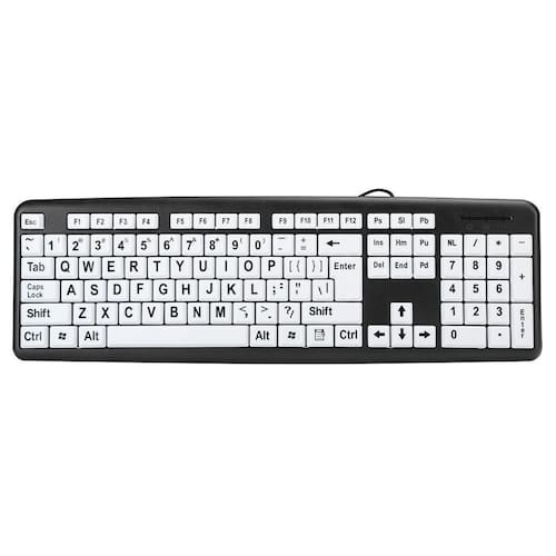 Especialmente desenvolvido para pessoas com baixa visão ou visão subnormal. Possui teclas na cor branca e letras pretas com tamanho aumentado 4x em relação aos tradicionais, possibilitando maior conforto e visibilidade para o uso do computador. Especificações: Teclas na cor branca com com letra grande preta. Modelo slim, mais fino e elegante. Conexão usb, cabo com 1.35 metros. Teclas macias e suave, com baixo ruído. Padrão us internacional, com acentuação. Manual de configuração incluso. Compatível com windows, ou linux. Marca: Não Informado