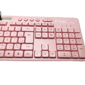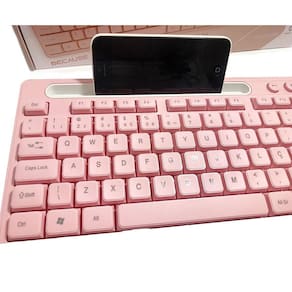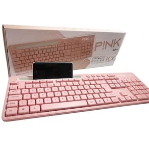 Teclado Rosa para Computador Notebook Com Suporte De Celular Chegou a hora de comprar aquele lindo teclado de computador na cor rosa. Com um design moderno, teclas macias e suporte para seu celular, você vai encantar-se com este novo modelo