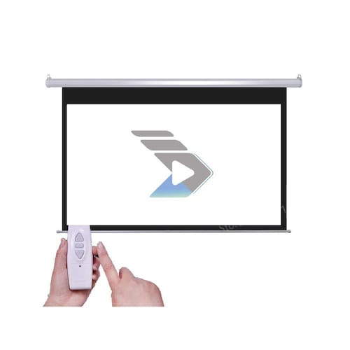 A tela de projeção elétrica da GRM vem com controle remoto sem fio e tem como opcional moldura para embutir no gesso.