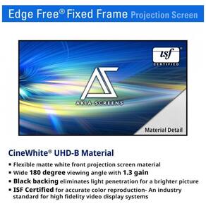 A tela de projeção fixa Akia Screens de 125 polegadas foi desenvolvida para uso em home theater, com formato 16:9 e design edge free que oferece aparência semelhante a uma TV de tela plana instalada na parede. A área de visão é de 2,77 m de largura por 1,56 m de altura, adequada para salas dedicadas de cinema residencial e ambientes internos de entretenimento.
