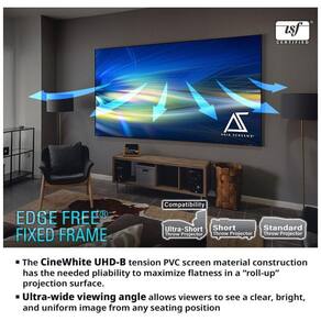 A superfície de projeção utiliza material CineWhite UHD-B com ganho de 1,3, ângulo de visão de 180° e fundo preto, o que melhora brilho, contraste e bloqueio de luz traseira. O material é certificado ISF para reprodução precisa de cores e suporta conteúdos em 8K, 4K Ultra HD e 3D ativo, sendo compatível com projetores de longo, curto e ultra curto alcance em ambientes internos.