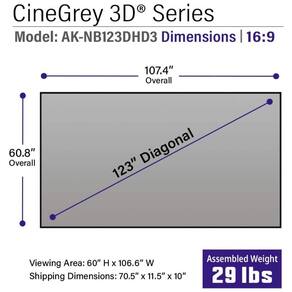 A tela de projeção fixa ALR de 123 polegadas da Akia Screens com material CineGrey 3D foi desenvolvida para uso com projetores de longo alcance padrão em ambientes internos, oferecendo grande área de visualização em formato 16:9 para home theater, salas de TV e salas multimídia. O material CineGrey 3D é uma superfície de rejeição de luz ambiente que reduz reflexos de teto e iluminação da sala em até 65%, elevando o contraste e os níveis de preto em comparação com telas brancas convencionais, sem gerar alterações significativas de cor.