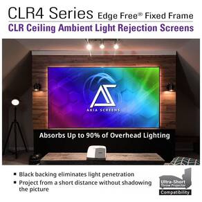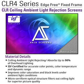 A tela de projeção fixa ALR de 123 polegadas da Akia Screens é projetada para uso com projetores de ultracurta distância instalados sobre mesa ou rack, oferecendo grande área de exibição em formato 16:9 para aplicações de cinema em casa e salas multimídia. O material de projeção utiliza tecnologia CLR4 (Ceiling Light Rejecting), que foi desenvolvida para reduzir a interferência da luz proveniente do teto, melhorar o nível de preto e aumentar o contraste em relação às telas brancas convencionais.