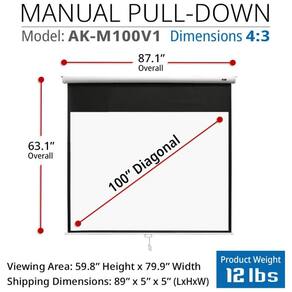 A tela de projeção manual retrátil Akia Screens de 100 polegadas foi desenvolvida para uso em home theater, escritórios e salas de aula que utilizam projetores de longo alcance no formato 4:3, mantendo compatibilidade com conteúdos em 16:9 e 16:10. Ela oferece área de projeção de 203 x 152 cm, em carcaça metálica branca para montagem em parede ou teto, acompanhada de suporte tipo L de 10 polegadas que afasta a tela da parede para melhor posicionamento em relação a portas, rodapés ou móveis.