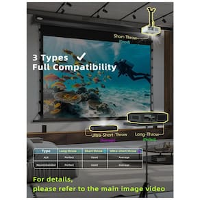 Conteúdo da embalagem: 1 tela de projeção motorizada 120", suportes e ferragens para teto/parede, controle remoto e manual do usuário em inglês