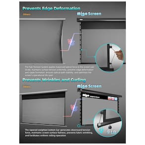 A área útil de exibição mede aproximadamente 266 cm de largura por 149 cm de altura, oferecendo uma tela grande para filmes, esportes e apresentações em grande formato. O sistema tab-tension utiliza cabos laterais de tensionamento e barra inferior com peso para manter a tela plana, reduzindo ondulações nas bordas e garantindo uma superfície uniforme para foco adequado em toda a imagem.