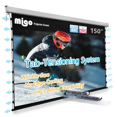 A tela de projeção motorizada MIGO de 150" com material cinza crystal foi desenvolvida para home theater salas amplas e ambientes corporativos que exigem imagem em grande formato 16:9 com bom contraste em luz ambiente parcial. A superfície cinza crystal com ganho 2.0 e ângulo de visão de aproximadamente 175 graus favorece maior brilho percebido e melhor contraste em conteúdos em alta definição quando utilizada com projetores a partir de 3000 lúmens.