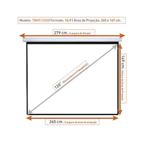 Modelo: TBMS120H Área de projeção: 265 x 149 cm Dimensões embalada: 13 x 15 x 299 cm Dimensões do estojo metálico: 11 x 09 x 279 cm Dimensões em polegadas: 120" Peso da embalagem: 13,2 Kg Peso do produto: 11,1 Kg Formato: 16:9 (Wide Screen) Garantia: 12 meses Bordas: Sim (pretas) Tecido: Matte White 1.1 Código de barras: 7896263941838