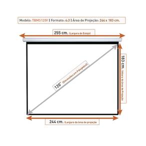 Modelo: TBMS120V Área de projeção: 244 x 183 cm Dimensões embalada: 10 x 13 x 274 cm Dimensões do estojo metálico: 07 x 09 x 255 cm Dimensões em polegadas: 120" Peso da embalagem: 11,5 Kg Peso do produto: 9,9 Kg Formato: 4:3 (Padrão Corporativo) Garantia: 12 meses Bordas: Sim (pretas) Tecido: Matte White 1.1 Código de barras: 7897570141287