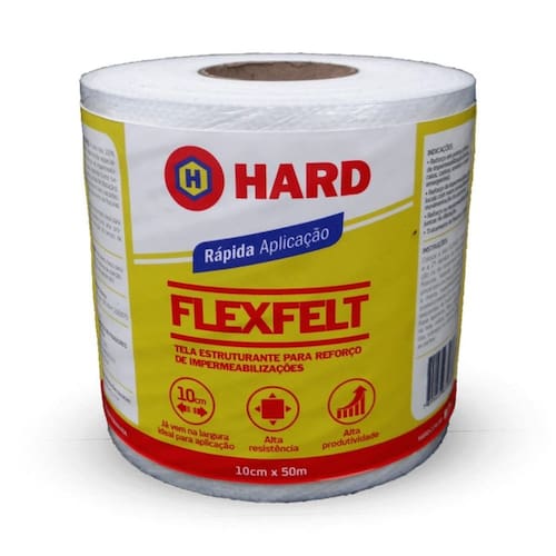 FLEXFELT é uma tela estruturante desenvolvida especialmente para reforço em pontos críticos da impermeabilização, como juntas, ralos, cantos, arestas, tubos emergentes, sobreposição de telhas, rufos, calhas e platibandas e tratamento de fissuras e trincas. Confeccionada no formato ideal para a aplicação, proporciona alta produtividade e redução do tempo de instalação. Disponível em duas versões: a standard para substratos porosos como concreto e a autoadesiva para substratos lisos como telhas metálicas . HARD FLEXFELT AUTOADESIVA é uma tela composta de polipropileno e selante butílico, desenvolvida especialmente para reforço de impermeabilização de áreas externas como: sobreposições de telhas, cumeeiras, platibandas, trincas e fissuras . Confeccionada no formato ideal para a aplicação, proporciona alta produtividade e redução no tempo de instalação.
