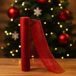 Destaque sua decoração natalina com a tela decorativa em malha tule trançado com fio vermelho brilhante, um modelo especial em tamanho gigante com 52cm de largura x 5 metros de comprimento. Versátil e elegante, é perfeita para ser entrelaçada em árvores de Natal, aplicada em guirlandas, arranjos ou utilizada na confecção de laços volumosos que trazem sofisticação e impacto visual.