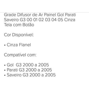 Descrição do produtoMais informaçõesMarca: 60249Descrição completaGrade difusor de ar painel gol parati saveiro g3 00 01 02 03 04 05 cinza tela com botãoCor disponível: Cinza flanelCompatível com: Gol g3 2000 a 2005 Parati g3 2000 a 2005 Saveiro g3 2000 a 2005Especificação técnica: Fabricado em plástico resistente Acabamento perfeito Possui botão para abrir e fechar Encaixe sob medida Disponível na cor cinza flanel Fácil instalação Conteúdo da embalagem: 1 grade do difusorImportante:Garantia de 3 meses.Valor unitário.Obs: recomendamos que a instalação seja feita por um profissional, pois não nós responsabilizamos pelo mau uso da peça.Agradecemos a sua visita Marca: 60249