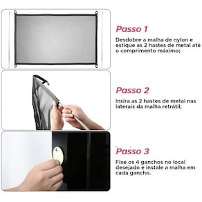 ITENS INCLUSOS: 01 (uma) Tela Pet de Proteção Para Cães; 04 (quatro) Ganchos auto colantes; 02 (dois)Tubos de metal.