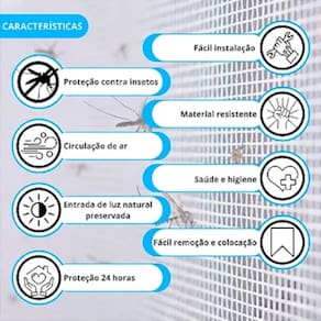 Proteção eficaz contra insetos – mantém mosquitos e outros insetos afastados, garantindo um ambiente mais saudável. Instalação rápida e sem ferramentas – basta cortar a tela no tamanho desejado e fixá-la na moldura da janela utilizando a fita adesiva inclusa. Fácil manutenção – para a limpeza diária, utilize um pano úmido ou aspirador de pó; para uma limpeza mais profunda, remova a tela, lave-a e reinstale após secagem. Durável e removível – fabricada em fibra de poliéster resistente, a tela é reutilizável e pode ser armazenada quando não estiver em uso. Transparente e discreta – o design da malha permite a passagem de luz e não obstrui a visão externa. Especificações Técnicas