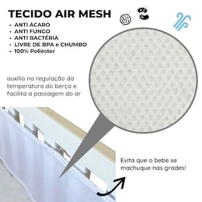 A Tela Respirável para Mini Berço é ideal para quem busca conforto e bem-estar no espaço do bebê. Produzida com tecido Air Mesh 100% poliéster, oferece uma malha leve e arejada que permite a circulação de ar, contribuindo para um ambiente mais agradável.