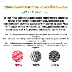 As telas pretas são utilizadas para proteção e sombreamento de diversas culturas, proporcionando maior produtividade. Tem característica multifuncional por se adequar aos mais diversos projetos agrícolas. Possui versão com as mesmas porcentagens de sombra, porém com gramatura menor, sendo as de maior gramatura indicadas para uso em estufas.