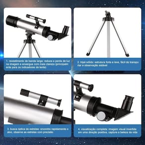 Telescópio astronômico portátil compacto ampliação 90x tripé ajustável crianças e iniciantes Nossa missão: oferecer produtos de alta qualidade, com preços acessíveis e a confiança que você merece. Bem-vindo a à nossa loja Conheça o telescópio astronômico de alta ampliação Características: Alta ampliação: telescópio refletor com duas lentes oculares 6 mm e 20 mm , proporcionando uma experiência visual nítida e detalhada, graças à sua ótica de vidro totalmente revestida e de alta transmissão. Fácil instalação: ideal para iniciantes e crianças, o telescópio pode ser montado rapidamente sem a necessidade de ferramentas, facilitando o uso desde o primeiro momento. Tripé resistente e rotação de 180: feito de alumínio leve e durável, o tripé de 38 cm é estável e fácil de transportar. Com rotação de 180, você tem flexibilidade total para explorar o céu. Incentivo ao aprendizado: perfeito para despertar o interesse das crianças pela astronomia, incentivando-as a explorar o universo enquanto desenvolvem bons hábitos de estudo e reduzindo o tempo na frente das telas. Conteúdo da embalagem: 01 telescópio f36050 01 lente 6 mm 01 lente 20 mm 01 lente ereta 1.5x 01 prisma 01 tripé ajustável de 38 cm 01 manual do usuário Em quanto tempo meu pedido será enviado É confiável Sim, somos uma loja oficial e todos os nossos produtos contam com , além da segurança oferecida pela plataforma. Os produtos possuem Sim, oferecemos uma de 30 dias em todos os nossos produtos. Caso haja qualquer problema, resolveremos da melhor forma possível. Faça sua pergunta e responderemos rapidamente Marca: Não Informado Ean: 0755779815286