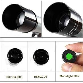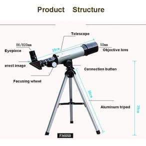 Informações sobre o produto O F36050 é um telescópio infantil de alta potência, com uma boa observação do desempenho dos corpos celestes. Os entusiastas usam e configuram as duas oculares de ampliação diferentes para deixar você livre para observar as diferentes distâncias e tamanhos do objeto. O espelho também pode ser utilizado como espelho de visão, você pode obter uma imagem completamente positiva. Contanto que você tenha imaginação suficiente, acho que haverá um uso mais interessante e prático. Estrutura: monocularCor do tubo principal: prata Distância focal: 360 mm Abertura óptica: 50 mm Pode definir 60 vezes, 18 vezes, o grupo de espelhos mais 1,5x90 vezes, 27 vezes. Resolução da teoria: 2.000 segundos de arco Abertura ativa: 50 mm (2,4 polegadas) Distância focal: 360 mm f/7 Espelho oblíquo: 90° Tripé mais alto: 34 cm O acessório padrão de 0,965 polegadas contém: Olho: SR4mm, H20mm, lente Barlow 3 vezes Tamanho da caixa: 440 mm * 210 mm * 100 mm