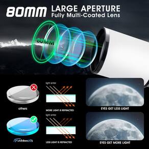 - Óptica superior: telescópio com lente objetiva de grande abertura de 80 mm fornece uma imagem mais clara e brilhante, distância focal de 600 mm, vidro óptico totalmente revestido com maior brilho e clareza, proteja seus olhos, telescópio refrator perfeito para iniciantes em astronomia ou crianças explorarem os interststícios celular, também telescópio para adultos de alta potência - Alta ampliação telescópios: Este é um ótimo telescópio para crianças, bem como telescópios para astronomia de adultos. O telescópio para astronomia vem com uma lente Barlow 3X e duas oculares, H25mm e H10mm, a ampliação varia de 60X a 150X. Você pode escolher livremente diferentes combinações para aproveitar as diferentes distâncias. Os telescópios também vêm com uma luneta de 5x24 para localização precisa