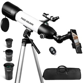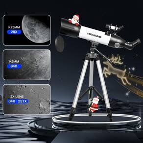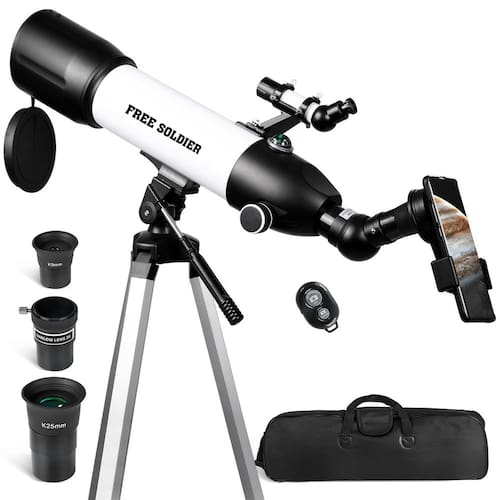 FREE SOLDIER Telescópio refrator de 80 mm de abertura de 500 mm para adultos de alta potência - Telescópio refratário astronômico profissional para iniciantes com adaptador de telefone branco - Telescópio de alta potência: o telescópio para adultos é equipado com abertura de 80 mm e distância focal de 500 mm, acompanhado por 3 lentes oculares Plossl (PL4, PL10 e PL20), que são superiores às oculares da série H&K e oferecem um campo de visão maior e muito mais claro. A mira localizadora de 5 x 24 permite a localização precisa e sem esforço do objeto. Ótimo telescópio para iniciantes e adultos para observar as estrelas, observar planetas e a lua! - Óptica profissional: o telescópio refrator está equipado com lentes ópticas multirevestidas que coletam mais luz, melhoram a transmissão de luz e reduzem a aberração cromática, tornando a imagem mais brilhante na ocular e oferecendo um campo de visão maior e muito mais claro. Seja no universo ou no cenário, você pode ter uma visão panorâmica. - Tripé ajustável e lente Zenith giratória de 360°: o poderoso telescópio oferece um tripé ajustável estável atualizado, que pode ajustar diferentes alturas e posições de visualização à vontade, proporcionando uma excelente experiência de observação. O telescópio para adultos de alta potência tem lentes Zenith rotativas de 360°, proporcionando aos astrônomos adultos e iniciantes uma experiência de observação confortável. - Fácil de montar: o telescópio para adultos iniciantes está equipado com um adaptador universal de telefone e controle remoto sem fio. Podemos capturá-lo e compartilhar com nossa família e amigos quando observarmos as crateras da lua ou da vida selvagem na natureza com este bom telescópio e adaptador de telefone para tirar fotos, vídeos e gravar. - Ótimo presente: o telescópio para adultos Astronomia tem instruções detalhadas para orientar a instalação, o que é fácil de usar para adultos iniciantes. Se você tiver alguma dúvida ou sugestão sobre o telescópio astronômico, a qualquer momento e ficaremos felizes em resolver quaisquer problemas para você. Aviso: perigo de asfixia, peças pequenas, não adequado para crianças menores de 3 anos.