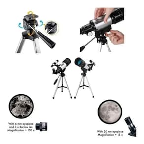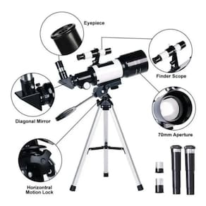 Modelo: F30070mMaterial: vidro óptico Cor: prata\ nAbertura: 70 mm (2,4 pol.)\ nComprimento focal: 360 mm f/4\ nEspelho oblíquo: 90 graus\ nMáquina de dobra\ nTrama e tripé de alumínio\ nMaior: 38 cm\ NPeso da embalagem: 1,643 kg\ NTamanho do produto (comprimento x largura x altura): 31,50 x 10,50 x10,50 cm/12,4 x Ocular de 4,13 x 4,13 polegadas: lente H6 mm, H20 MM3x lente positiva Barlow1.5X Filtro de lua: como há muita luz refletida que interfere na observação da lua cheia, podemos usar o filtro lunar para evitar interferências e, em seguida, a superfície da lua ficará mais bonita claramente. -Enrosque o filtro lunar na rosca da parte inferior da lente ocular e, em seguida, conecte a lente ocular à lente zenital. A fórmula: -Distância focal da lente/distância focal da ocular x multiplicador Barlow = ampliação máxima - distância focal da lente = distância focal da lente/distância focal da ocular = ampliação 1 x telescópio astronômico 2 x ocular1 x tripé 2 x Barlowlens 1 x Filter Moon