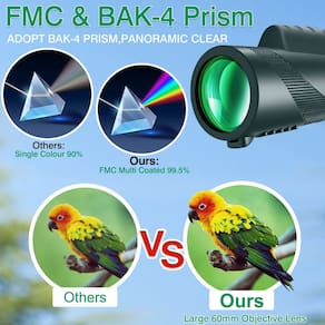 IMPORTANTE: Se for um produto elétrico, ele pode ser compatível com uma tomada de 110 volts. Se utilizado fora dos Estados Unidos, pode ser necessário um conversor de voltagem para garantir a operação adequada. Verifique se o produto que você está comprando é elétrico antes de considerar essas informações. Telescópio monocular 50X60, monóculos para adultos de alta potência, prisma BAK-4 compacto HD de alta potência e lente FMC, observação de estrelas, observação de pássaros selvagens, viagens, acampamento, caminhada (verde) -?Telescópio monocular de alta definição 50 × 60?O monocular tem uma ampliação de 50 vezes e lente objetiva de 60 mm com lentes totalmente revestidas para melhorar o taxa de transmissão de luz e resolução, para que seu campo de visão seja mais claro, a imagem seja mais clara e nítida, ideal para entusiastas de atividades ao ar livre e exploradores da natureza, um dispositivo portátil e indispensável para observação de pássaros, vida selvagem, caça, caminhadas, montanhismo, camping, vigilância e viagens. -?Adaptador e tripé de smartphone de alta estabilidade?Telescópio monocular para smartphone equipado com adaptador de smartphone, adequado para quase todos os telefones celulares do mercado, iPhone, Android, etc. Tripé robusto atualizado com alta estabilidade, permitindo obter imagens nítidas e sem tremores. -?Óptica de alta definição e visão noturna com pouca luz?Este monocular compacto HD de alta potência é equipado com prismas BAK-4 e lentes totalmente multirrevestidas para garantir excelente transmissão de luz e brilho. Com uma taxa de transmissão de luz de 99,5%, a visão noturna monocular tem uma função de visão noturna com pouca luz que permite ver com pouca luz. -?Compacto e fácil de usar?O monocular compacto HD de alta potência é compacto, leve, feito de materiais de alta qualidade, à prova d'água, à prova de neblina e poeira, e permite ajustar a nitidez do campo focal com uma mão, mesmo com os óculos. -?Ideal para atividades ao ar livre?Monocular especialmente projetado para entusiastas de atividades ao ar livre. É adequado para uma variedade de esportes ao ar livre: caça, observação de animais, montanhismo, camping, viagens, caminhadas, esportes aquáticos, jogos de bola, observação de paisagens, condução, concertos, monitoramento, exploração ao ar livre e outras atividades. Ofereça uma experiência visual incrível!