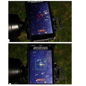 O suporte de smartphone, alinhado ao tubo óptico, garante que seu aparelho esteja apontado na mesma direção do escopo, de modo que a localização do objeto na tela do aparelho e na ocular sejam as mesmas.