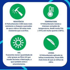 Iluminação natural abundante Economia de energia Resistente a impactos, raios UV e intempéries Fácil instalação e baixa manutenção Elimina umidade que causam fungos e mofos Protege sua cobertura contra animais noturnos