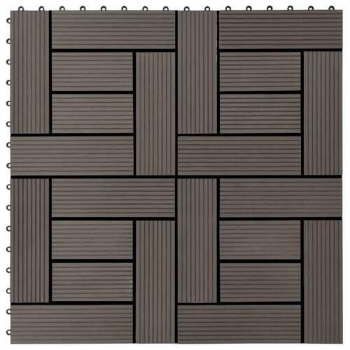 - Cor: marrom escuro- - Material: composto de plástico de madeira (WPC) - - Tamanho individual do ladrilho: 11,8" x 11,8" (C x L) - - Área total: 1 m²- - A entrega inclui 11 ladrilhos de deck- - Proposta 65 da Califórnia