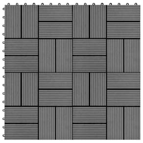 - Cor: cinza- - Material: composto de plástico de madeira (WPC) - - Tamanho individual do ladrilho: 11,8" x 11,8" (C x L) - - Área total: 1 m²- - A entrega inclui 11 ladrilhos de deck- - Proposta 65 da Califórnia