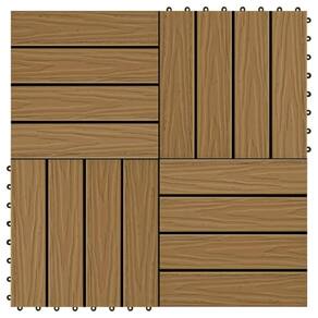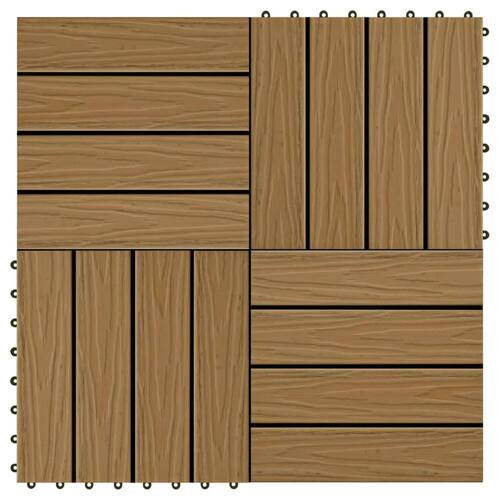 O conjunto de ladrilhos de deck WPC com relevo profundo, com um tamanho de ladrilho individual de 11,8 “x 11,8", consiste em 11 peças e cobre uma área de superfície total de 1 metro quadrado. Isso dará uma aparência limpa ao seu pátio, varanda, banheiro ou piscina ou área de spa.