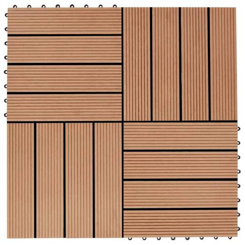 Este conjunto de ladrilhos de deck WPC, com um tamanho de ladrilho individual de 11,8 “x 11,8", consiste em 11 peças e cobre uma área de superfície total de 10,8 pés². Será ótimo para pátios, varandas, banheiros ou sua piscina ou área de spa