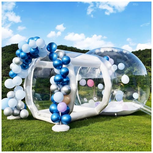 Mergulhe na experiência única da Tenda de Bolha Inflável Transparente da mais alta qualidade. Feita de PVC comercial durável (0,4mm + 0,6mm), essa tenda esférica transparente oferece uma vista de 360 graus para o céu diurno e estrelado à noite. Com 3m de diâmetro e 3m de altura, é espaçosa o suficiente para acomodar uma cama de 2,1m e até 4 pessoas, proporcionando conforto e relaxamento sob o céu estrelado. Fácil de montar e desmontar, inclui uma bomba de ar de 650W e uma de 550W para inflar em apenas 5 minutos. Ideal para camping, eventos ao ar livre, festas e encontros comerciais.